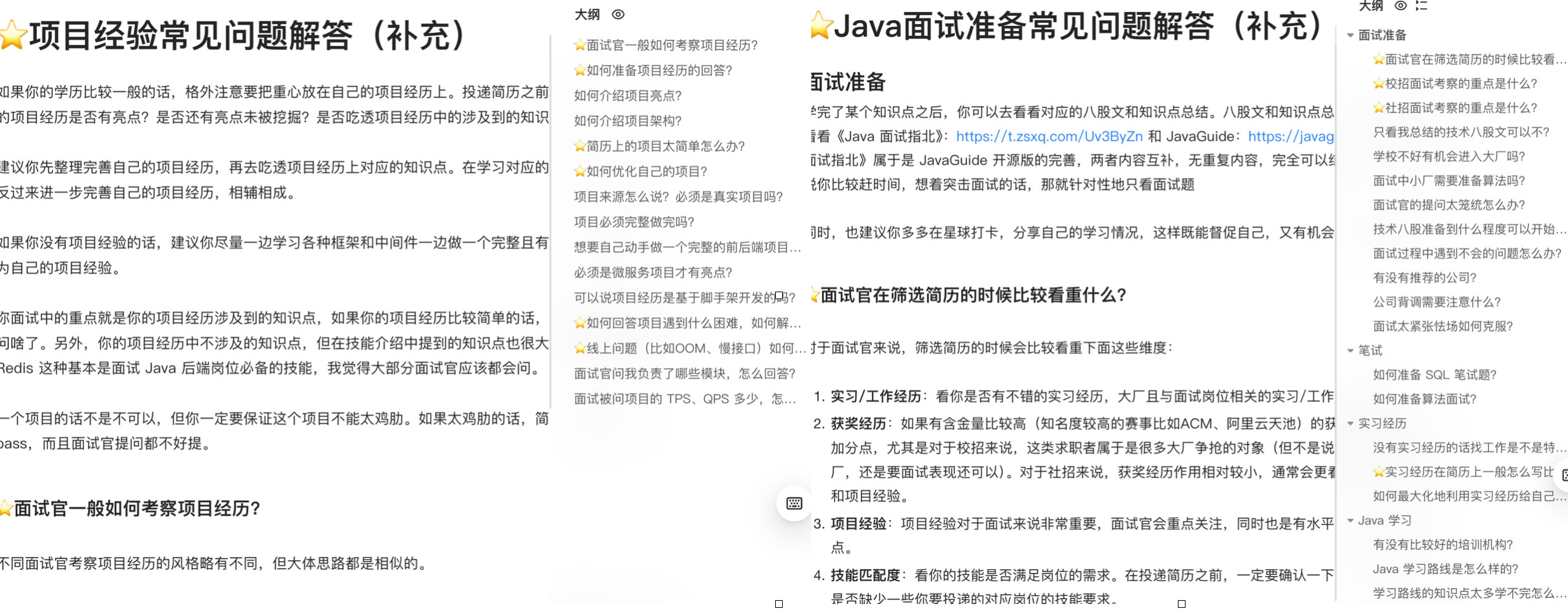 其中的 「⭐Java 面试准备常见问题解答(补充)」 和 「⭐ 项目经验常见问题解答(补充)」 强烈建议必看,信息密度非常高!