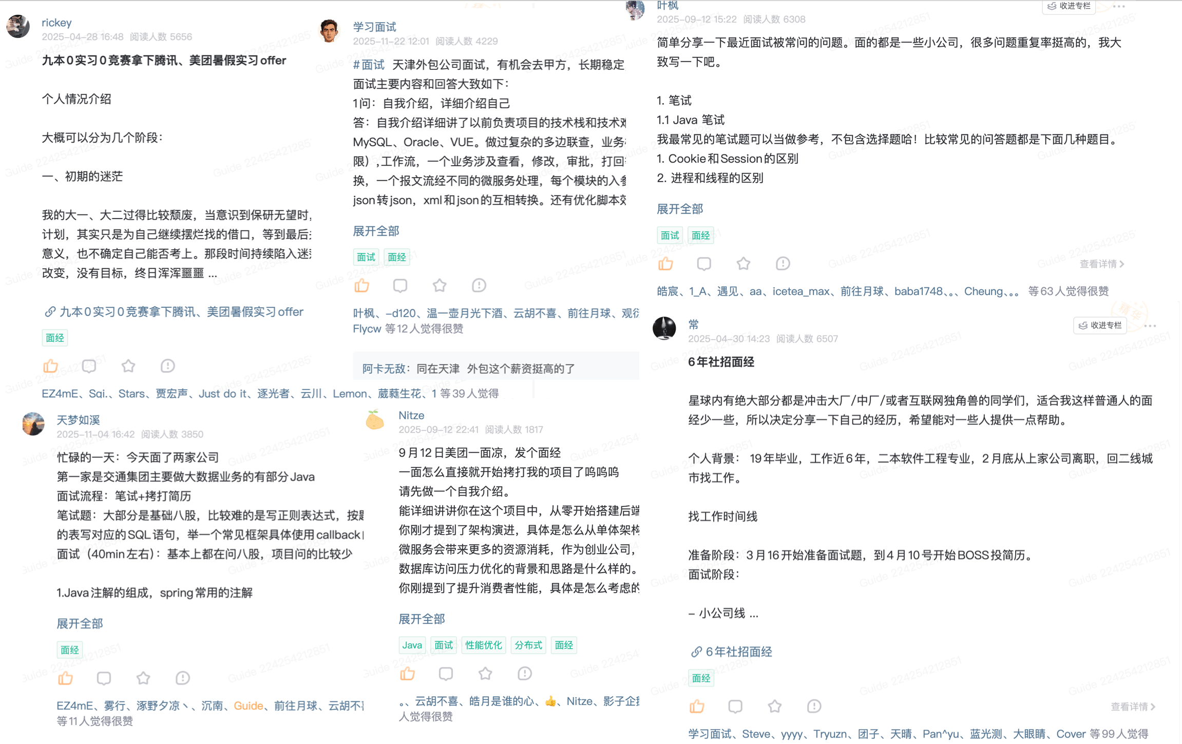 「面经篇」 主打高质量 Java 后端真实面经:校招 / 社招全覆盖,大厂、中小厂、央国企、外企,连大厂内包都有,不管你是哪种求职方向,都能找到适配的面经参考。